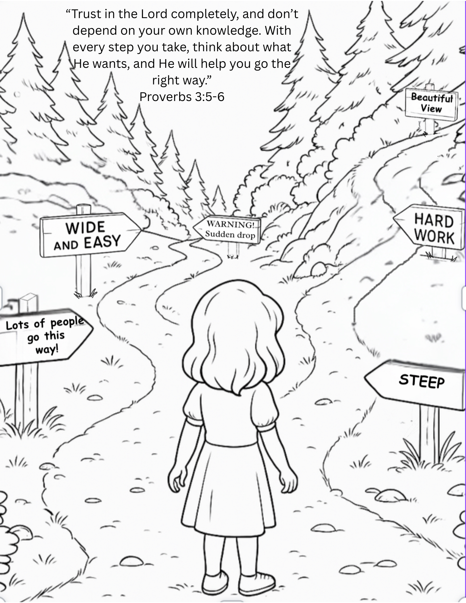 This verse reminds kids that they can trust God, even when they don’t understand what’s happening. As they color this page, they’ll learn that following God means listening to Him, praying, and knowing He’s leading them on the right path—even when it feels twisty or slow.