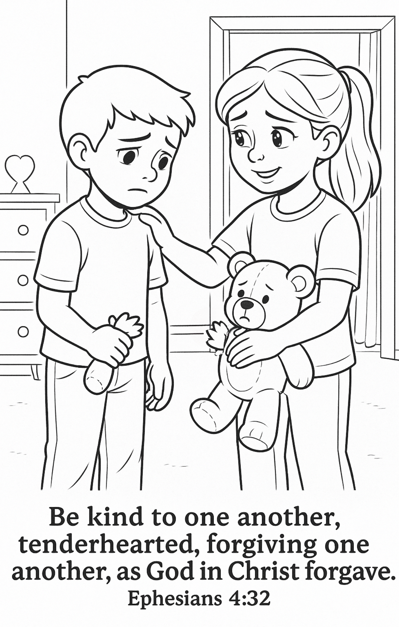 This verse reminds kids that kindness and forgiveness are how we love like Jesus. As they color this page, they’ll learn that being gentle with others—especially when it’s hard—is a powerful way to reflect God’s heart. Forgiving others doesn’t mean forgetting, but it does mean letting God’s love lead.